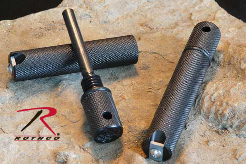 INCLUDES A CYLINDER WITH BUILT IN 440C STAINLESS STEEL BLADE AT THE OUTSIDE BASE WHICH IS STRUCK BY THE 1/4" THICK FERRO-MAGNESIUM ROD, CREATING A SPARK.