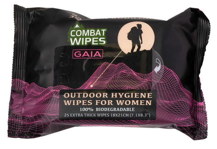 COMBAT WIPES™ GAIA ist das ideale Outdoor-Hygiene-Feuchttuch speziell für Frauen. COMBAT WIPES™ GAIA sind unverzichtbar für jede Frau, die draußen unterwegs ist und keinen Zugang zu einer Dusche hat und ihre Hygiene aufrechterhalten, erfrischt bleiben und umweltbewusst bleiben möchte. Jedes Wischtuch ist einzeln gefaltet und lässt sich einfach und ohne Probleme der Packung entnehmen. Im Boden vergraben verrottet das Wischtuch nach ca. 3 Monaten rückstandsfrei.