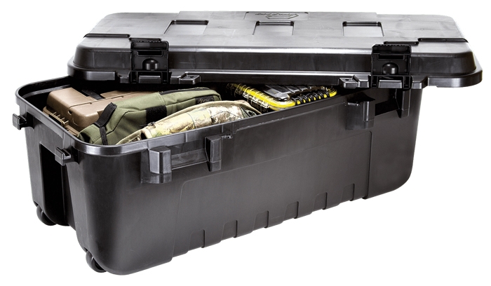 Die Plano® Transportbox "Heavy Duty Sportsman's Trunk" mit Transportrollen ist aus hochschlagfestem, wetterbeständigem Kunststoff und für vielseitige Anwendungen im professionellen Bereich sowie für Freizeit-Aktivitäten geeignet. Der komplett abnehmbare Deckel liegt eng auf und wird mit vier hochbelastbaren, rostfreien Klappverschlüssen verschlossen. Darüber hinaus verfügt sie über vier vorgebohrte Löcher zum Anbringen von Vorhängeschlössern und an den Enden über „Nasen" für Bungees, zum zusätzlichen fixieren des Deckels. Die Transportbox kann aufgrund ihrer Form sicher übereinander gestapelt werden.