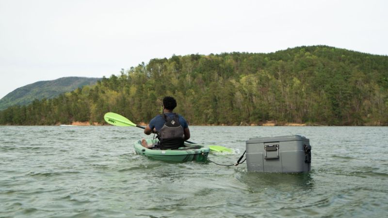 Die Kühlbox ist so leicht wie kaum eine andere Box und schwimmt auch beladen im Wasser mit.
