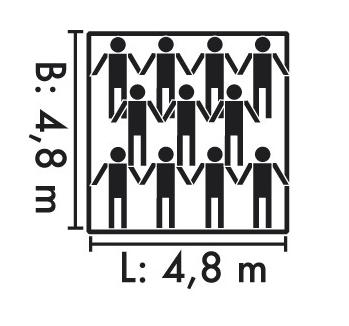 Das Zelt hat eine rechteckige Grundfläche von 23,04qm (L=4,8m x B=4,8m)